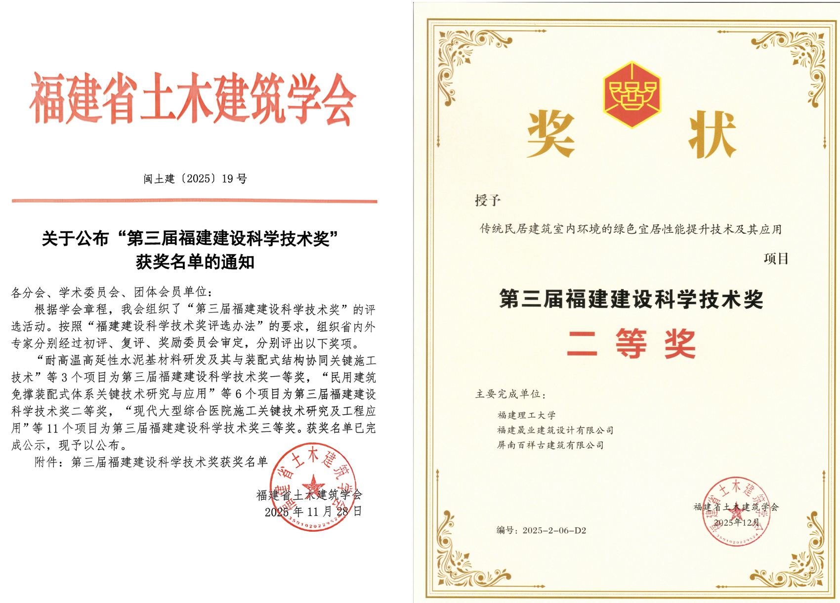 近日,“第三届福建建设科学技术奖”获奖项目揭晓,福建晟业设计与福建理工大学公共申报的“传统民居建筑室内环境的绿色宜居性能提升技术及其应用”荣获二等奖。